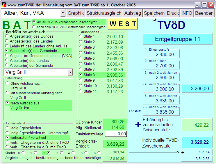 Am 1.10.2005 erfolgt auf der Grundlage des dann zustehenden sog. "Persönlichen Entgelts" (Grundvergütung; Ortszuschlag ledig/oder verheiratet und allgemeine Zulage) eine betragsmäßige Überleitung auf die neue  Entgelttabelle. Dabei wird jede bisherige Vergütungsgruppe einer neuen Entgeltgruppe zugeordnet. Da nie der exakte Tabellenwert